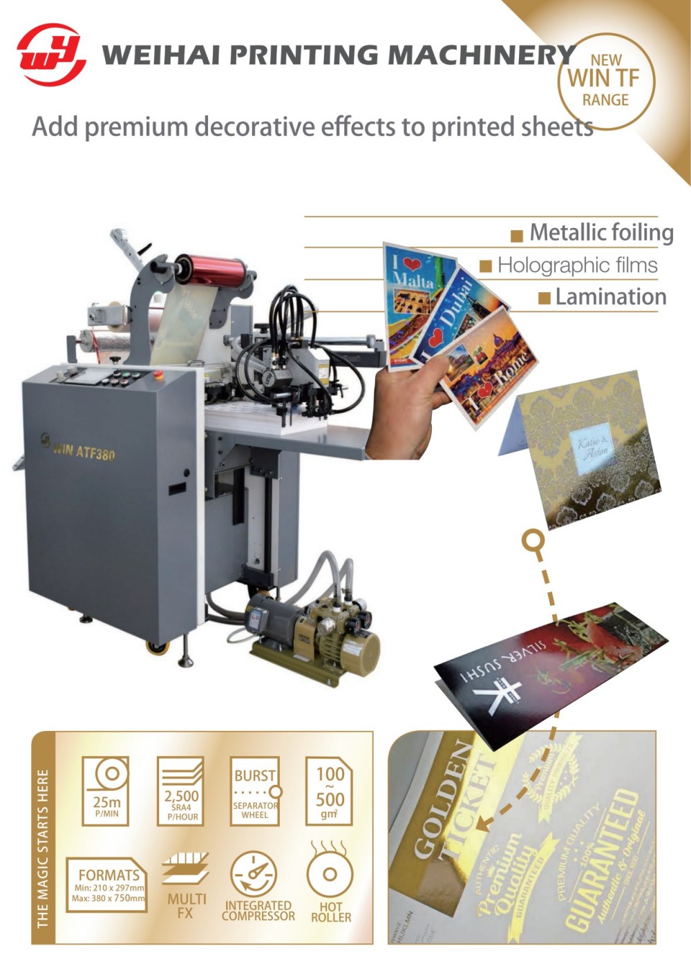 Пресија за ламинирање и фолирање со 380 мм напојување со листови е способна за автоматско вжештено печатење на метални и обоени обрасци без традиционални врели плочи за печат. Погоден е не само за краткорочни дигитални апликации на барање, туку и за традиционални литографски офсет излези. Користи холографски филмови за автоматско создавање на шаблони со точки и водени бранови, што ги прави печатените материјали уште попрефинети.