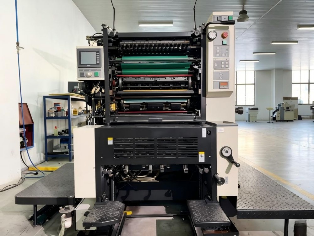 Ова е офсет преса за печатење на етикети А2 со две бои. Направен е за мали до средни производни серии. Се е до ефикасноста и лесното користење. Може да отпечати две бои во еден пасус за хартија. Тоа заштедува време и работа. Има уред за брзо позиционирање и затегнување за монтирање на плоча. Ова го намалува времето на промена. Има и полуавтоматски систем за чистење на ролери со мастило, кој ги забрзува промените на бојата и го олеснува обемот на работа на операторот. Пресата има систем за континуирано хранење хартија. Спарен е со вакуумска маса за вшмукување и три ротирачки транспортни ремени. Ова поставување добро се справува со различни дебелини на хартија. Двојните пружини држачи го спречуваат лизгањето на хартијата. Тоа е клучно за печатење со голема брзина. Има и практични карактеристики. Работи како навлажнување со алкохол и автоматско прилагодување на волуменот на водата. Има и квалитетна испорака на хартија со воздушни млазници и тркала за вшмукување.